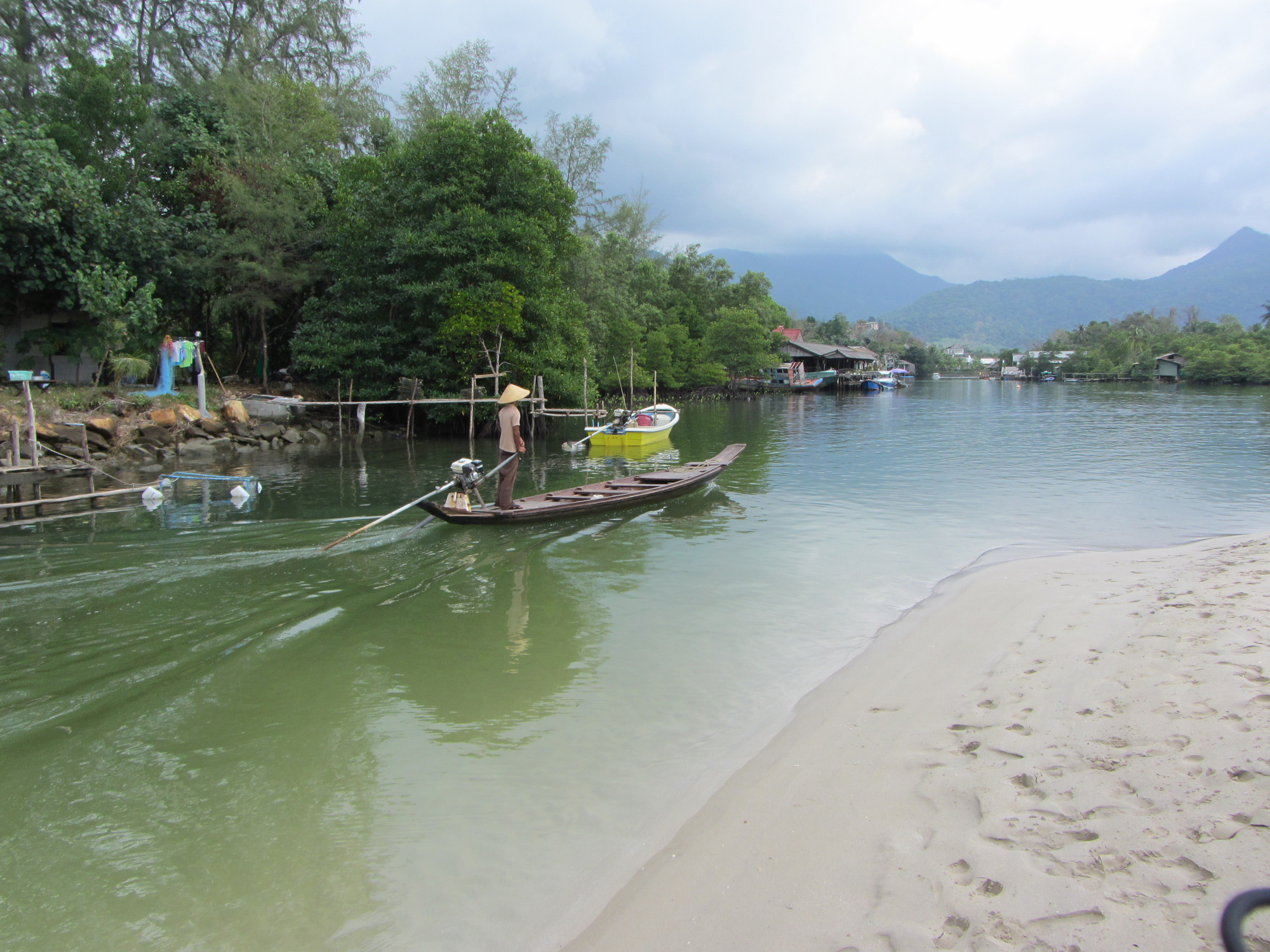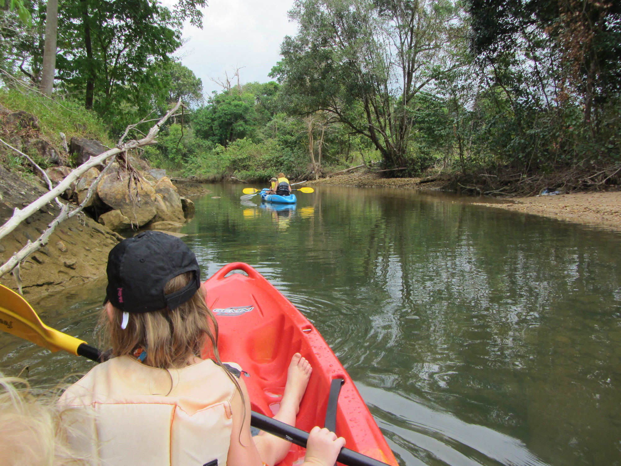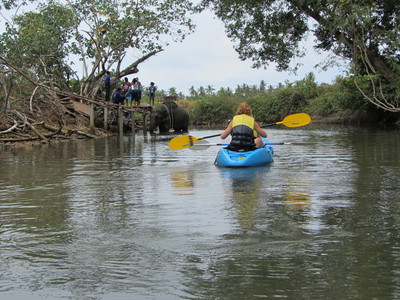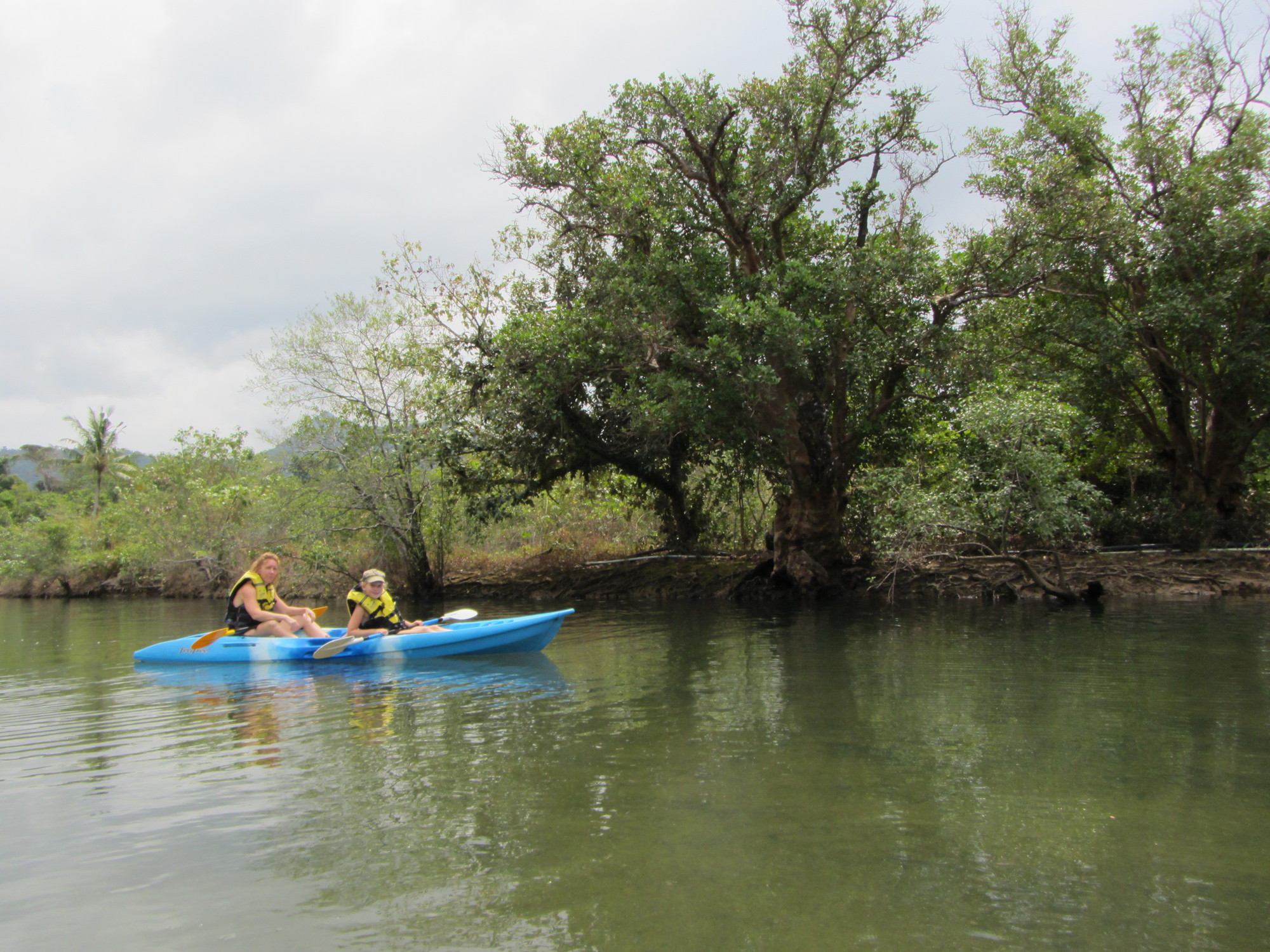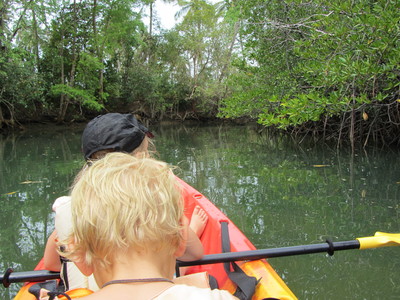 I går hyrde vi kajaker och åkte ut och paddlade. Det var helmysigt och vi han med att se både mangroveträd, fina fiskar, thailändare i tomteluva som varnade för krokodiler, elefanter som badade, stora snäckor (dock fyllda med eremitkräftor så vi lät de fina snäckorna var kvar i havet) och stora rovfåglar.