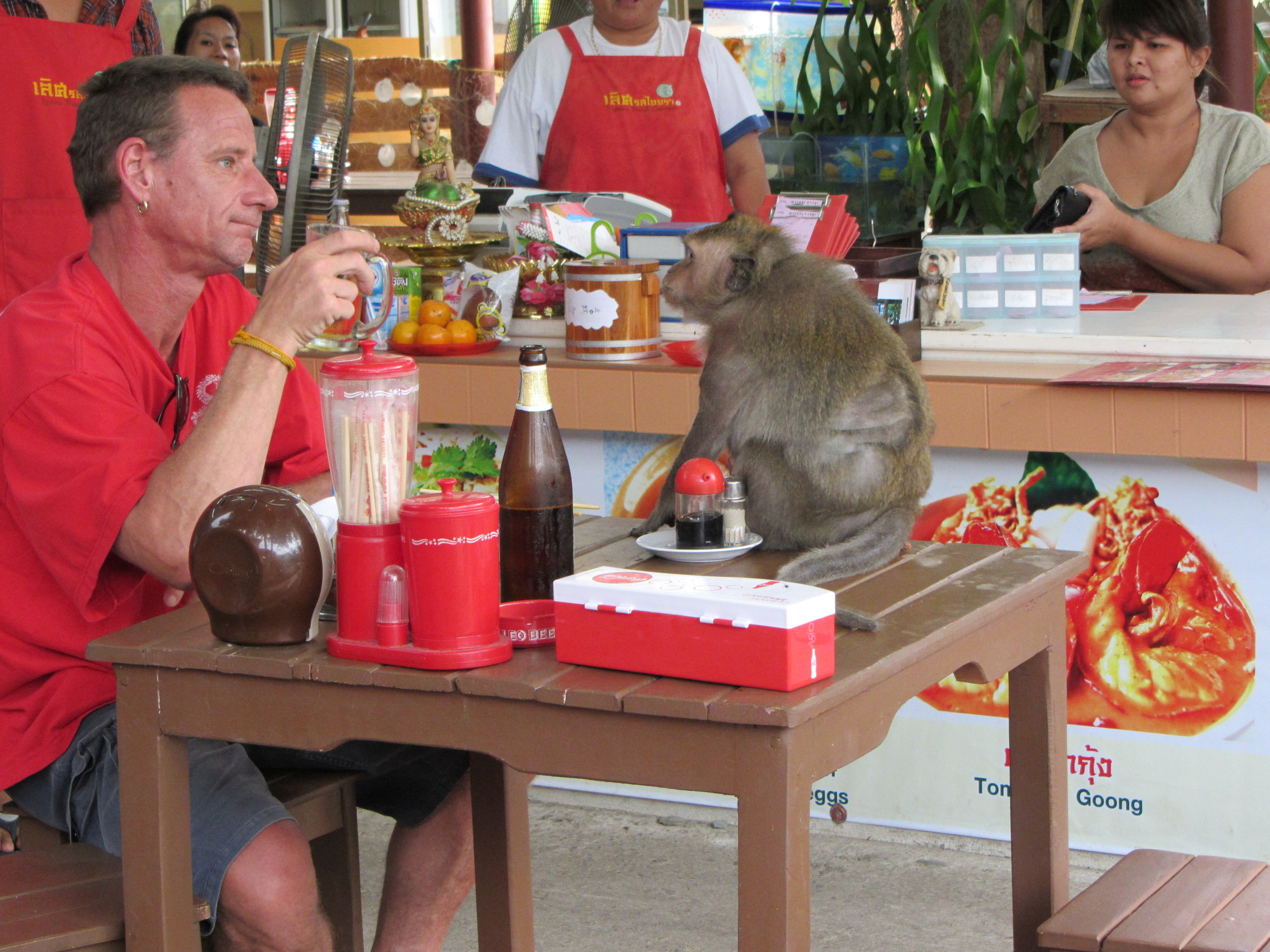 På bageriet dök det helt plötligt upp en apa i koppel. I änden av kopplet, där det i vanliga fall brukar vara en människa, fanns… ingen alls. Apan bara kom, betede som som kung, visade tänderna, hoppade upp på borden, tog turisternas mat, hade ner glas i marken och betedde sig allmänt stökigt. Allt medan både Thailändare och faranger skrämt tittade på.